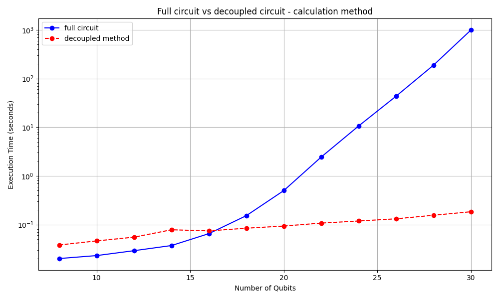 The figure illustrates the performance difference between the classical expectation value calculation on the full circuit and the proposed method for exploiting decoupled circuit structures. From the results, we observe a significant computational advantage for circuits with more than \(16\) qubits. The circuits were split into two parts, reducing the computational complexity of each subcircuit to half of the original complexity. We can see that the computational expense for preparing and splitting the circuit, compared to the overall computational time, becomes negligible for higher qubit counts but remains significant for smaller circuits.