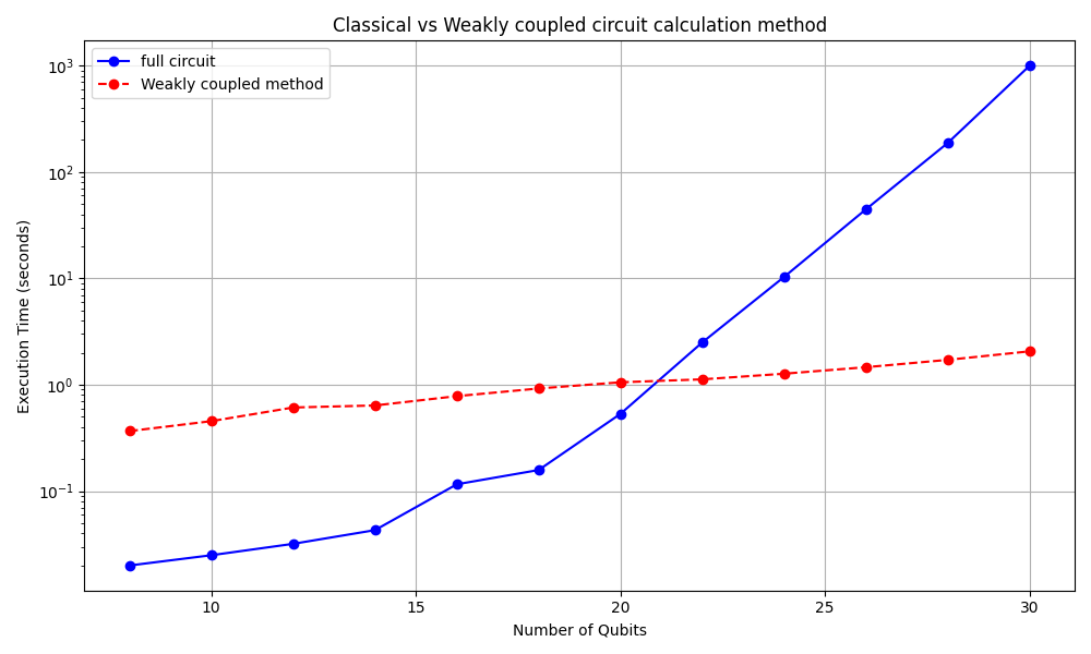 The figure illustrates the performance difference between the classical expectation value calculation and the proposed method for exploiting weakly coupled circuit structures. From the results, we observe that the computational advantage becomes significant only for circuits with more than \(>20\) qubits. The complexity of the calculation was reduced to multiple factors of half the original complexity.