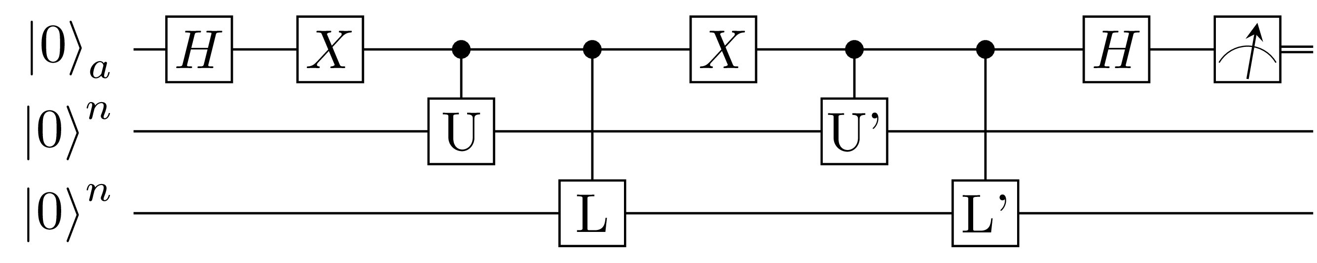 \[ \frac{1}{\sqrt{2}} \cdot (\ket{+} \otimes (U \otimes L \: \ket{0})) + \frac{1}{\sqrt{2}} \cdot (\ket{-} \otimes (U' \otimes L' \: \ket{0})) \equiv \ket{\psi}\]