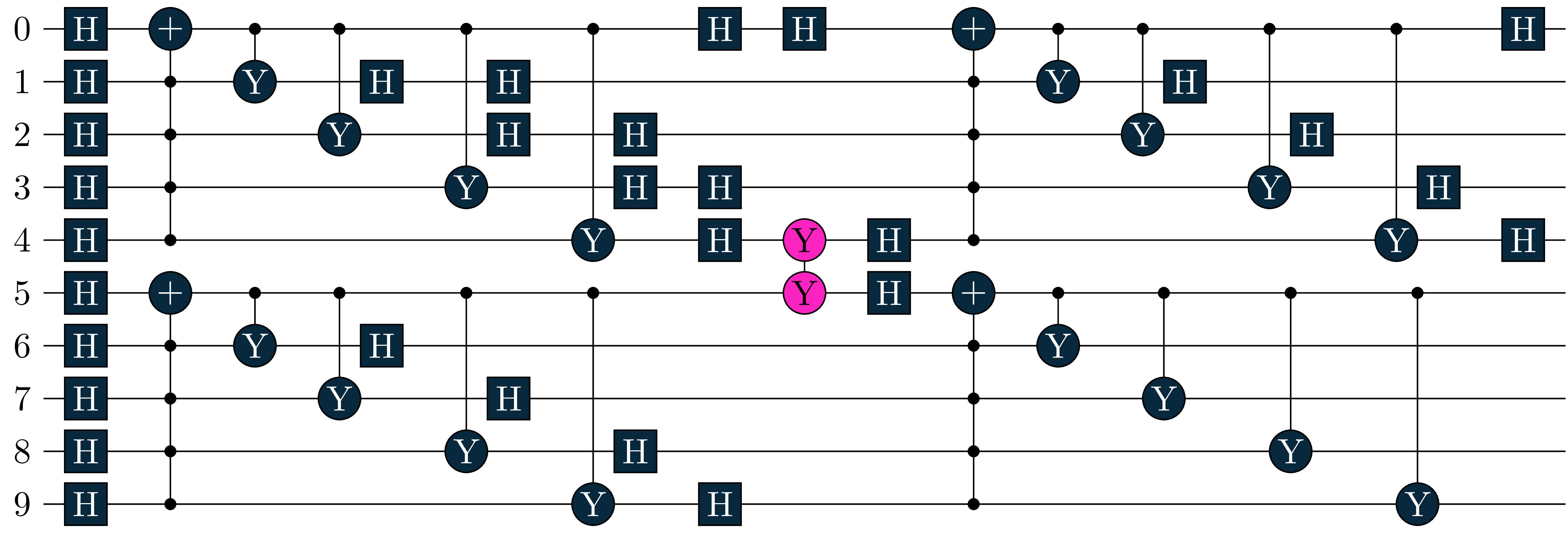 In the case of weakly coupled circuits, we follow the same initial construction process but introduce a coupling between the groups, at an arbitary point (in our example we choose the middle of the circuit). The coupling is implemented through a unitary operation of the form \(B = e^{-i\cdot\frac{\theta}{2}\cdot P}\), where the Paulistring \(P\) is allowed to act on qubits of both groups. The following figure shows an example circuit for testing the weakly coupled circuit calculation method, consisting of two groups with a total of 10 qubits. The groups are weakly linked by a Pauli gate (marked in pink).