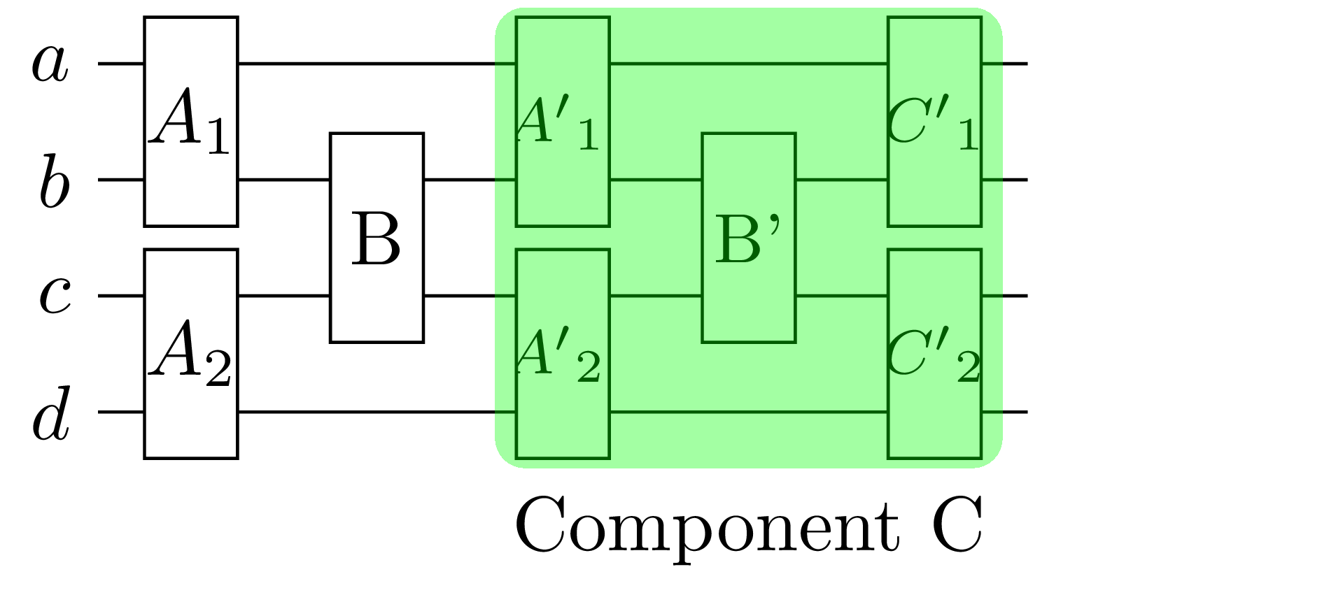 A promising use case for our weakly coupled method involves circuits with multiple weak connections distributed throughout their structure. In such scenarios, we can adapt the core methodology by decomposing the circuit recursivly. Consider an example circuit with the following structure: