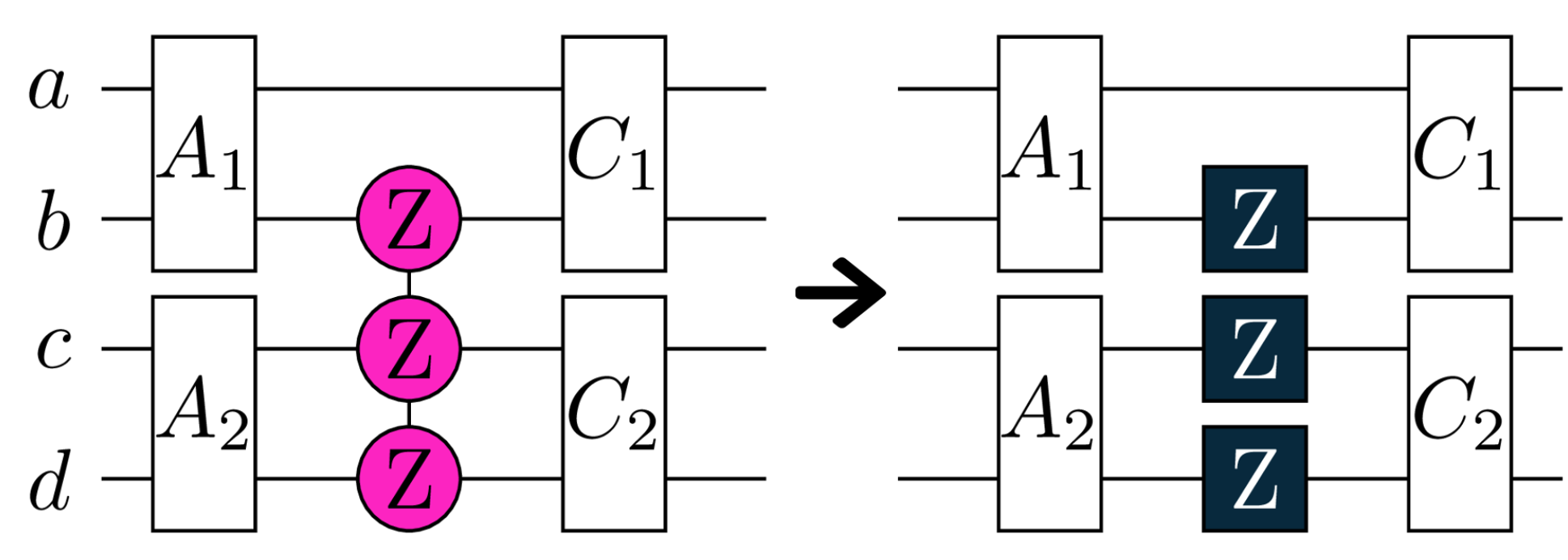 Here, \(P\) is a Paulistring with length \(n\) and \(A\) and \(C\) are independent, but each connected to \(B\). Since \(A\) and \(C\) contain fully disconnected parts, we can apply our horizontal decomposition method to each, thereby achieving a computational advantage. To fully decouple the circuit, we deconstruct \(B\) into \(n\) individual Pauligates.